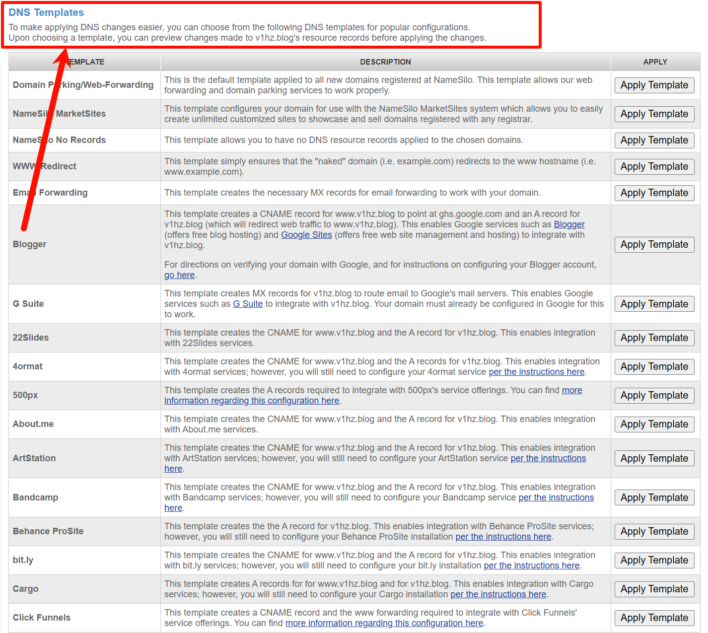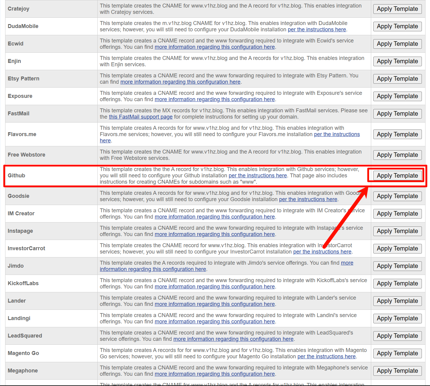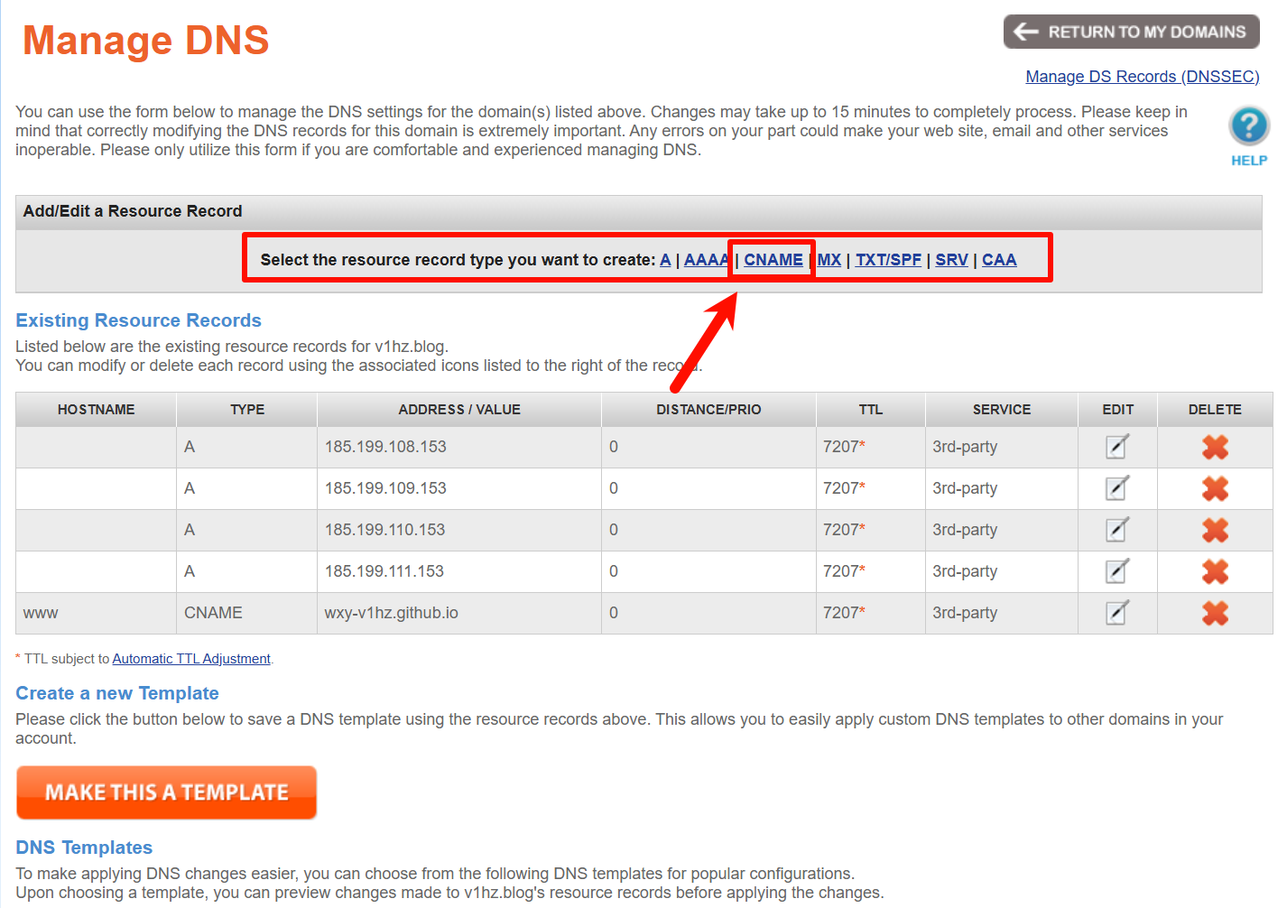 Apply Template,然后在 DNS 记录中会自动添加四条