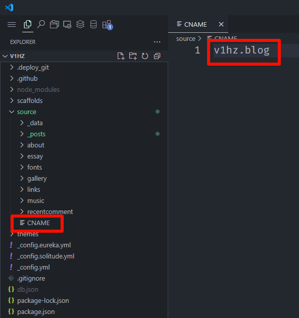 在 hexo 源代码目录的 source 文件夹中添加 CNAME 文件(全大写,无后缀),内容为自己购买的域名