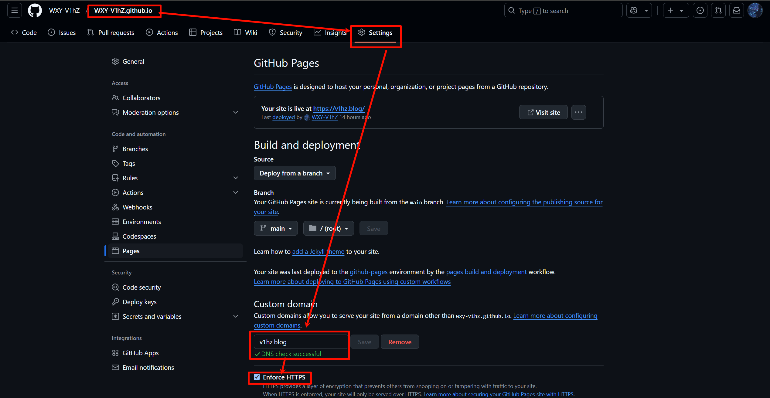 在 Github 的 hexo 仓库中,进入 Settings → Pages → Custom domain